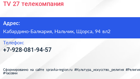 TV-27, телекомпания по адресу Кабардино-Балкария, Нальчик, Щорса, 94 вл2 в дальнейшем Организация, размещена в следующих категориях: