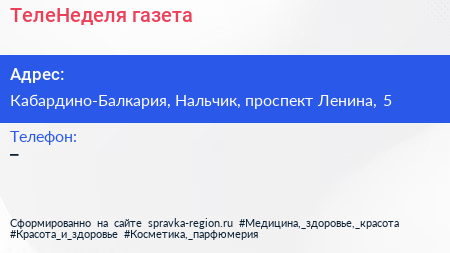 ТелеНеделя, газета по адресу Кабардино-Балкария, Нальчик, проспект Ленина, 5 в дальнейшем Организация, размещена в следующих категориях: