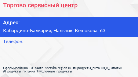 Торгово-сервисный центр по адресу Кабардино-Балкария, Нальчик, Кешокова, 63 в дальнейшем Организация, размещена в следующих категориях: