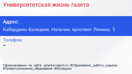 Университетская жизнь, газета по адресу Кабардино-Балкария, Нальчик, проспект Ленина, 5 в дальнейшем Организация, размещена в следующих категориях: