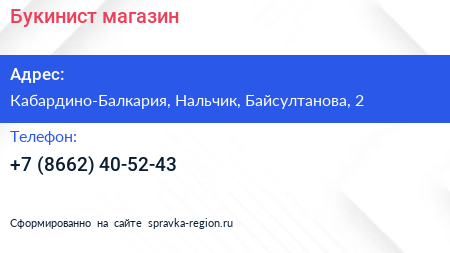 Букинист, магазин по адресу Кабардино-Балкария, Нальчик, Байсултанова, 2 в дальнейшем Организация, размещена в следующих категориях:
