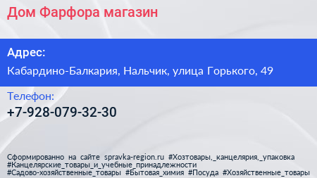 Дом Фарфора, магазин по адресу Кабардино-Балкария, Нальчик, улица Горького, 49 в дальнейшем Организация, размещена в следующих категориях: