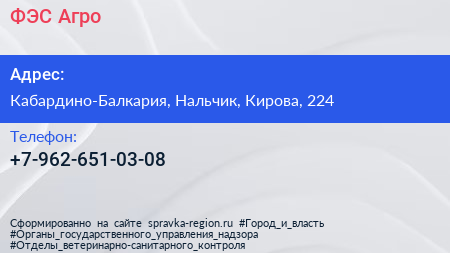 ФЭС-Агро по адресу Кабардино-Балкария, Нальчик, Кирова, 224 в дальнейшем Организация, размещена в следующих категориях: