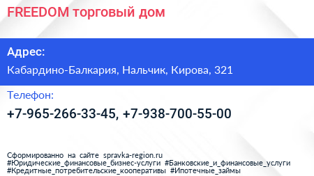 FREEDOM, торговый дом по адресу Кабардино-Балкария, Нальчик, Кирова, 321 в дальнейшем Организация, размещена в следующих категориях: