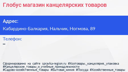 Глобус, магазин канцелярских товаров по адресу Кабардино-Балкария, Нальчик, Ногмова, 89 в дальнейшем Организация, размещена в следующих категориях: