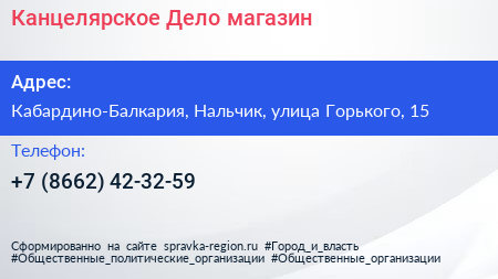 Канцелярское Дело, магазин по адресу Кабардино-Балкария, Нальчик, улица Горького, 15 в дальнейшем Организация, размещена в следующих категориях: