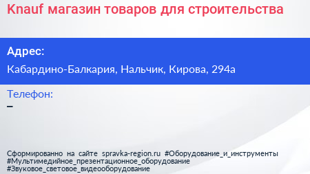 Knauf, магазин товаров для строительства по адресу Кабардино-Балкария, Нальчик, Кирова, 294а в дальнейшем Организация, размещена в следующих категориях: