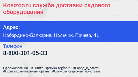 Kosizon.ru, служба доставки садового оборудования по адресу Кабардино-Балкария, Нальчик, Пачева, 41 в дальнейшем Организация, размещена в следующих категориях: