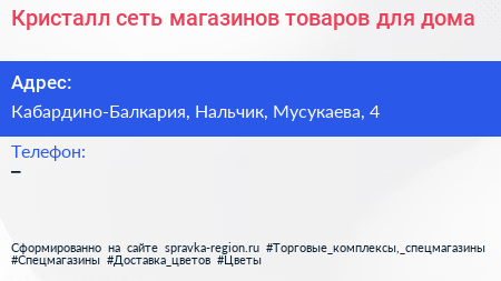 Кристалл, сеть магазинов товаров для дома по адресу Кабардино-Балкария, Нальчик, Мусукаева, 4 в дальнейшем Организация, размещена в следующих категориях: