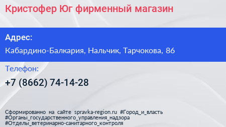 Кристофер-Юг, фирменный магазин по адресу Кабардино-Балкария, Нальчик, Тарчокова, 86 в дальнейшем Организация, размещена в следующих категориях: