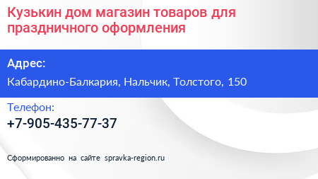 Кузькин дом, магазин товаров для праздничного оформления по адресу Кабардино-Балкария, Нальчик, Толстого, 150 в дальнейшем Организация, размещена в следующих категориях: