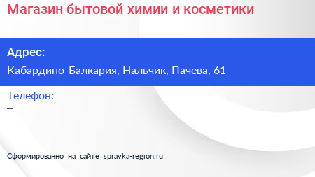 Магазин бытовой химии и косметики по адресу Кабардино-Балкария, Нальчик, Пачева, 61 в дальнейшем Организация, размещена в следующих категориях: