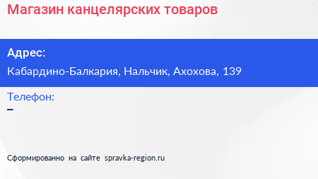 Магазин канцелярских товаров по адресу Кабардино-Балкария, Нальчик, Ахохова, 139 в дальнейшем Организация, размещена в следующих категориях:
