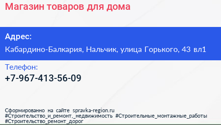 Магазин товаров для дома по адресу Кабардино-Балкария, Нальчик, улица Горького, 43 вл1 в дальнейшем Организация, размещена в следующих категориях: