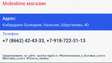 Moleskine, магазин по адресу Кабардино-Балкария, Нальчик, Шортанова, 40 в дальнейшем Организация, размещена в следующих категориях: