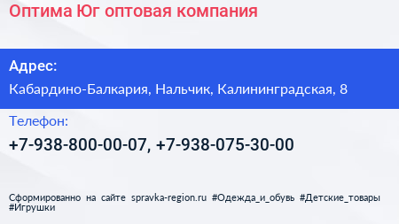 Оптима-Юг, оптовая компания по адресу Кабардино-Балкария, Нальчик, Калининградская, 8 в дальнейшем Организация, размещена в следующих категориях: