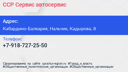 ССР-Сервис, автосервис по адресу Кабардино-Балкария, Нальчик, Кадырова, 8 в дальнейшем Организация, размещена в следующих категориях: