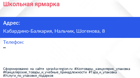 Школьная ярмарка по адресу Кабардино-Балкария, Нальчик, Шогенова, 8 в дальнейшем Организация, размещена в следующих категориях: