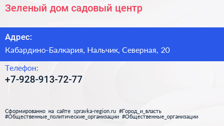 Зеленый дом, садовый центр по адресу Кабардино-Балкария, Нальчик, Северная, 20 в дальнейшем Организация, размещена в следующих категориях: