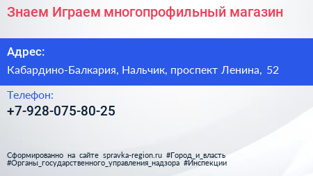Знаем Играем, многопрофильный магазин по адресу Кабардино-Балкария, Нальчик, проспект Ленина, 52 в дальнейшем Организация, размещена в следующих категориях: