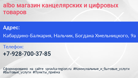 albo, магазин канцелярских и цифровых товаров по адресу Кабардино-Балкария, Нальчик, Богдана Хмельницкого, 9а в дальнейшем Организация, размещена в следующих категориях: