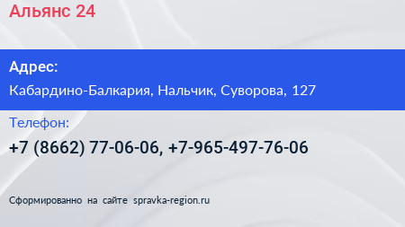 Альянс 24 по адресу Кабардино-Балкария, Нальчик, Суворова, 127 в дальнейшем Организация, размещена в следующих категориях: