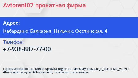 Avtorent07, прокатная фирма по адресу Кабардино-Балкария, Нальчик, Осетинская, 4 в дальнейшем Организация, размещена в следующих категориях: