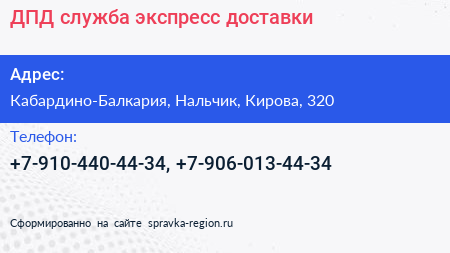 ДПД, служба экспресс-доставки по адресу Кабардино-Балкария, Нальчик, Кирова, 320 в дальнейшем Организация, размещена в следующих категориях: