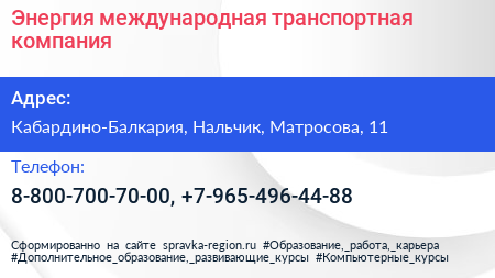 Энергия, международная транспортная компания по адресу Кабардино-Балкария, Нальчик, Матросова, 11 в дальнейшем Организация, размещена в следующих категориях: