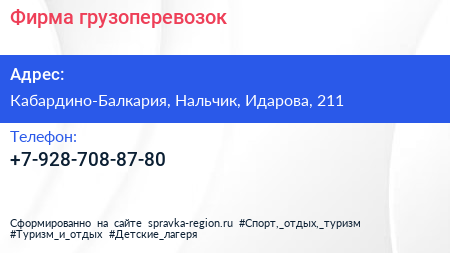 Фирма грузоперевозок по адресу Кабардино-Балкария, Нальчик, Идарова, 211 в дальнейшем Организация, размещена в следующих категориях:
