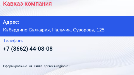 Кавказ, компания по адресу Кабардино-Балкария, Нальчик, Суворова, 125 в дальнейшем Организация, размещена в следующих категориях: