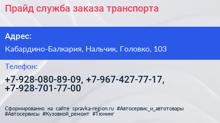 Прайд, служба заказа транспорта по адресу Кабардино-Балкария, Нальчик, Головко, 103 в дальнейшем Организация, размещена в следующих категориях: