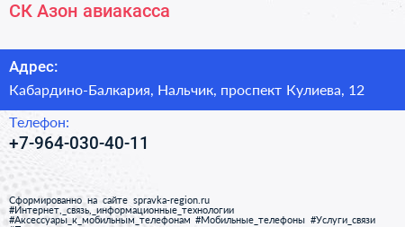 СК-Азон, авиакасса по адресу Кабардино-Балкария, Нальчик, проспект Кулиева, 12 в дальнейшем Организация, размещена в следующих категориях: