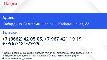 Шагди по адресу Кабардино-Балкария, Нальчик, Кабардинская, 66 в дальнейшем Организация, размещена в следующих категориях: