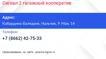 Сигнал-2, гагажный кооператив по адресу Кабардино-Балкария, Нальчик, 9 Мая, 14 в дальнейшем Организация, размещена в следующих категориях: