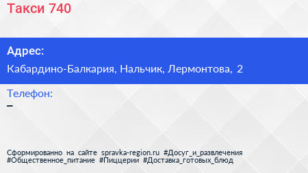 Такси 740 по адресу Кабардино-Балкария, Нальчик, Лермонтова, 2 в дальнейшем Организация, размещена в следующих категориях: