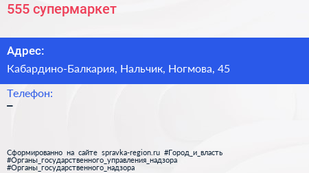 555, супермаркет по адресу Кабардино-Балкария, Нальчик, Ногмова, 45 в дальнейшем Организация, размещена в следующих категориях: