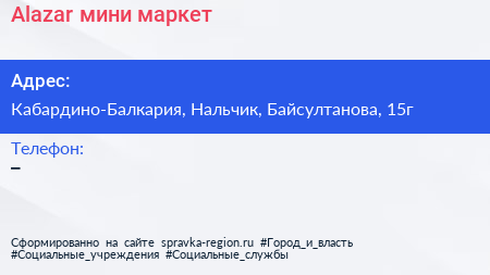 Alazar, мини-маркет по адресу Кабардино-Балкария, Нальчик, Байсултанова, 15г в дальнейшем Организация, размещена в следующих категориях: