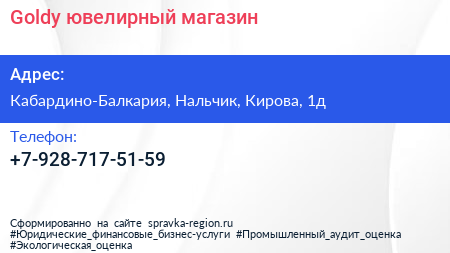 Goldy, ювелирный магазин по адресу Кабардино-Балкария, Нальчик, Кирова, 1д в дальнейшем Организация, размещена в следующих категориях: