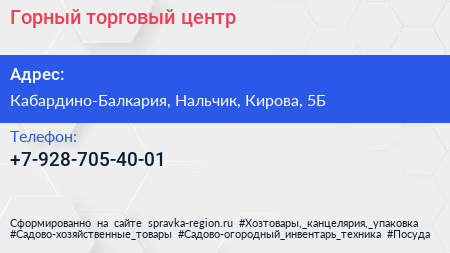 Горный, торговый центр по адресу Кабардино-Балкария, Нальчик, Кирова, 5Б в дальнейшем Организация, размещена в следующих категориях: