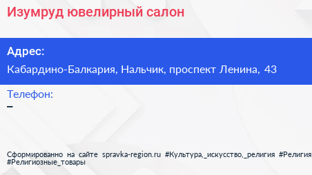 Изумруд, ювелирный салон по адресу Кабардино-Балкария, Нальчик, проспект Ленина, 43 в дальнейшем Организация, размещена в следующих категориях: