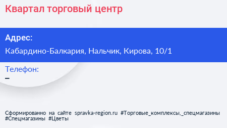 Квартал, торговый центр по адресу Кабардино-Балкария, Нальчик, Кирова, 10/1 в дальнейшем Организация, размещена в следующих категориях: