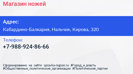Магазин ножей по адресу Кабардино-Балкария, Нальчик, Кирова, 320 в дальнейшем Организация, размещена в следующих категориях: