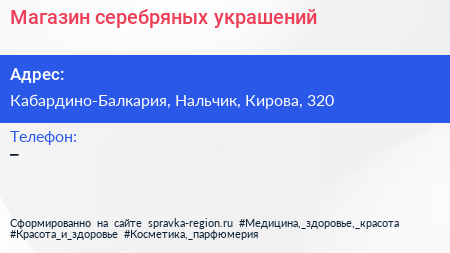 Магазин серебряных украшений по адресу Кабардино-Балкария, Нальчик, Кирова, 320 в дальнейшем Организация, размещена в следующих категориях: