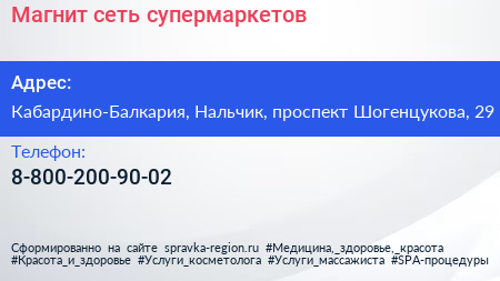 Магнит, сеть супермаркетов по адресу Кабардино-Балкария, Нальчик, проспект Шогенцукова, 29 в дальнейшем Организация, размещена в следующих категориях: