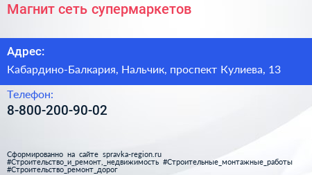 Магнит, сеть супермаркетов по адресу Кабардино-Балкария, Нальчик, проспект Кулиева, 13 в дальнейшем Организация, размещена в следующих категориях: