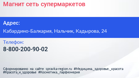 Магнит, сеть супермаркетов по адресу Кабардино-Балкария, Нальчик, Кадырова, 24 в дальнейшем Организация, размещена в следующих категориях: