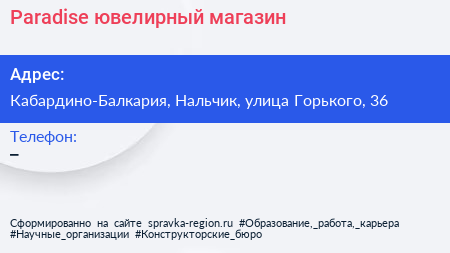 Paradise, ювелирный магазин по адресу Кабардино-Балкария, Нальчик, улица Горького, 36 в дальнейшем Организация, размещена в следующих категориях: