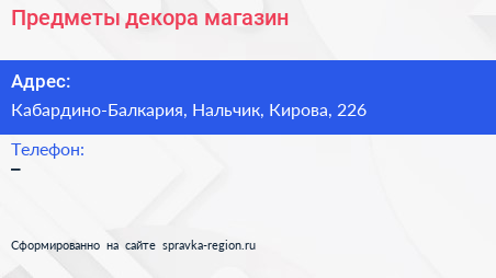 Предметы декора, магазин по адресу Кабардино-Балкария, Нальчик, Кирова, 226 в дальнейшем Организация, размещена в следующих категориях: