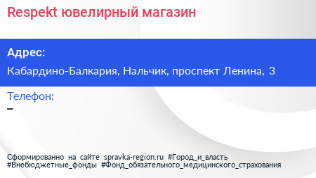 Respekt, ювелирный магазин по адресу Кабардино-Балкария, Нальчик, проспект Ленина, 3 в дальнейшем Организация, размещена в следующих категориях:
